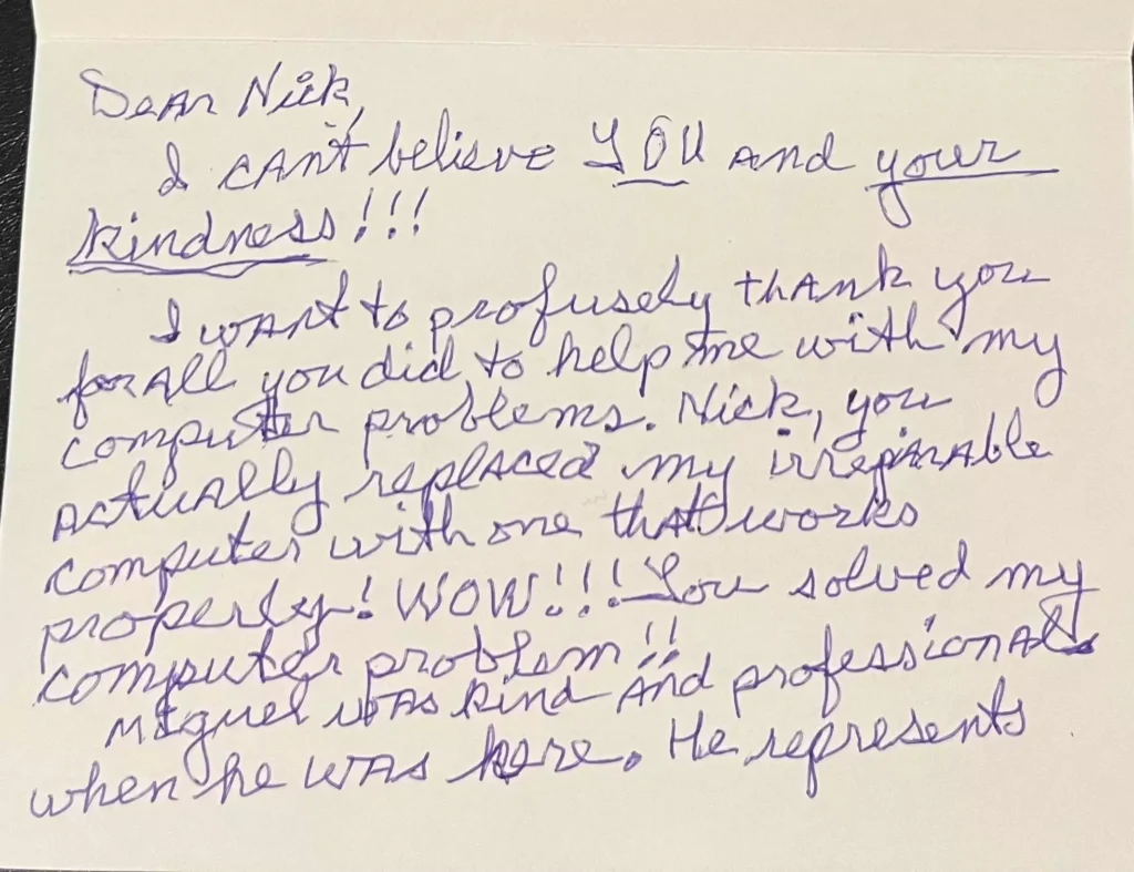 I can’t believe you and your kindness! I want to profusely thank you for all you did to help me with my computer problems. Nic, you actually replaced my irreparable computer with one that works properly. WOW! You solved my computer problem!! Miguel was kind and professional when he was here. He represents your company very well!!